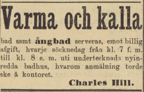 "Varma och kalla bad samt ångbad serveras emot billig afgift (...)