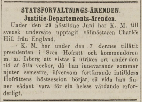 Charles skickar in ansökan om att bli svensk medborgare som beviljas av kung Oskar I. Samtidigt får han ett erbjudande om att bli aktieägare i ett nytt mekaniskt bomullsväveri i Norrköping. Den nya aktiebolagslagen som kom ett par år tidigare har öppnat upp dörrar. Det är nu möjligt att starta företag med kapital från flera olika ägare. Charles tackar ja till erbjudandet.
